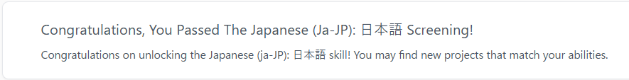 合格すると下記のように日本語スクリーニングに合格した、というメッセージが表示されます。
